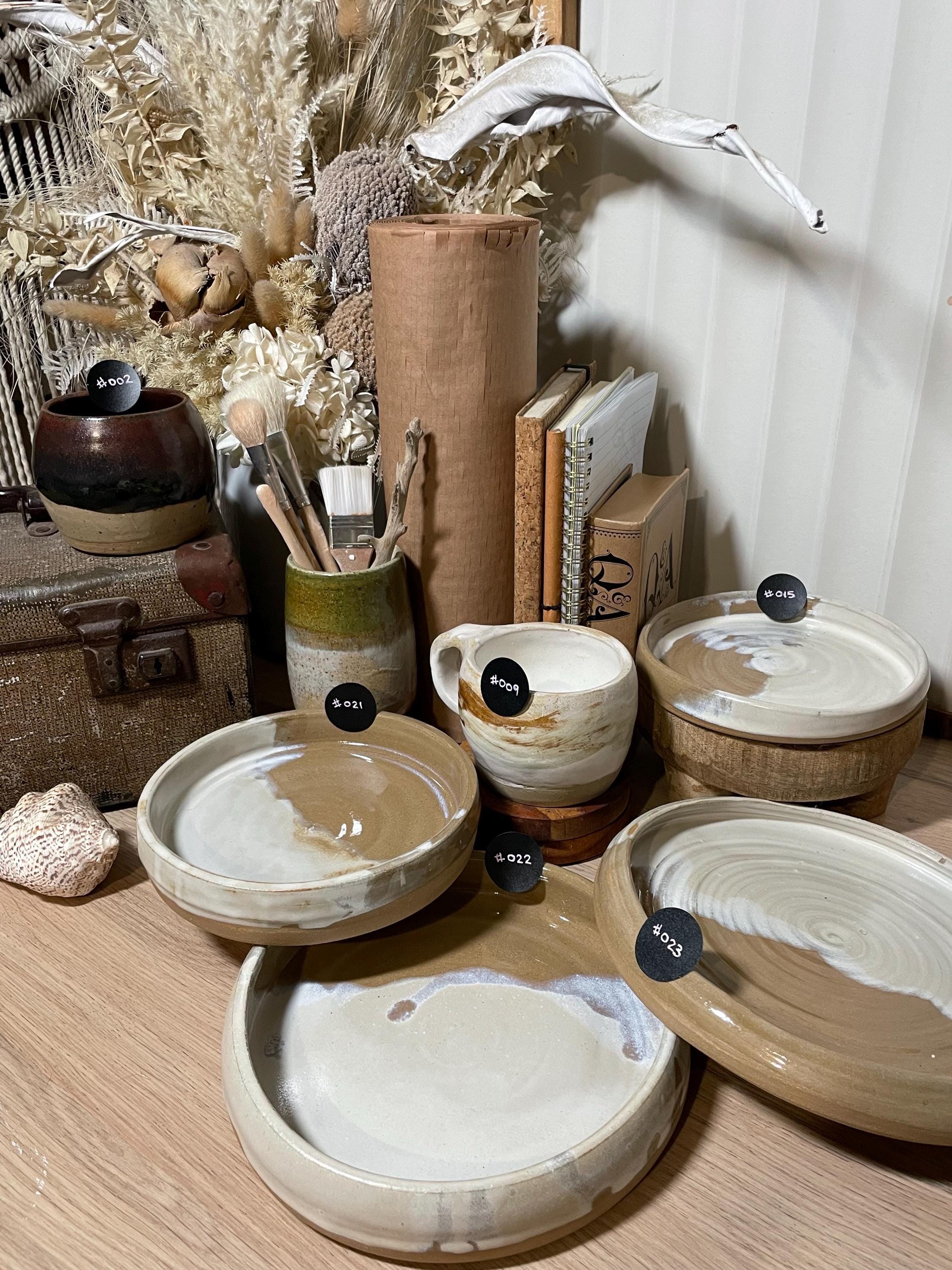 Each ceramic piece is uniquely crafted over a period of weeks; hand-thrown on a wheel, dried, trimmed and crafted, bisque-fired, glazed, re-fired, sanded and cleaned. No two pieces are the same.