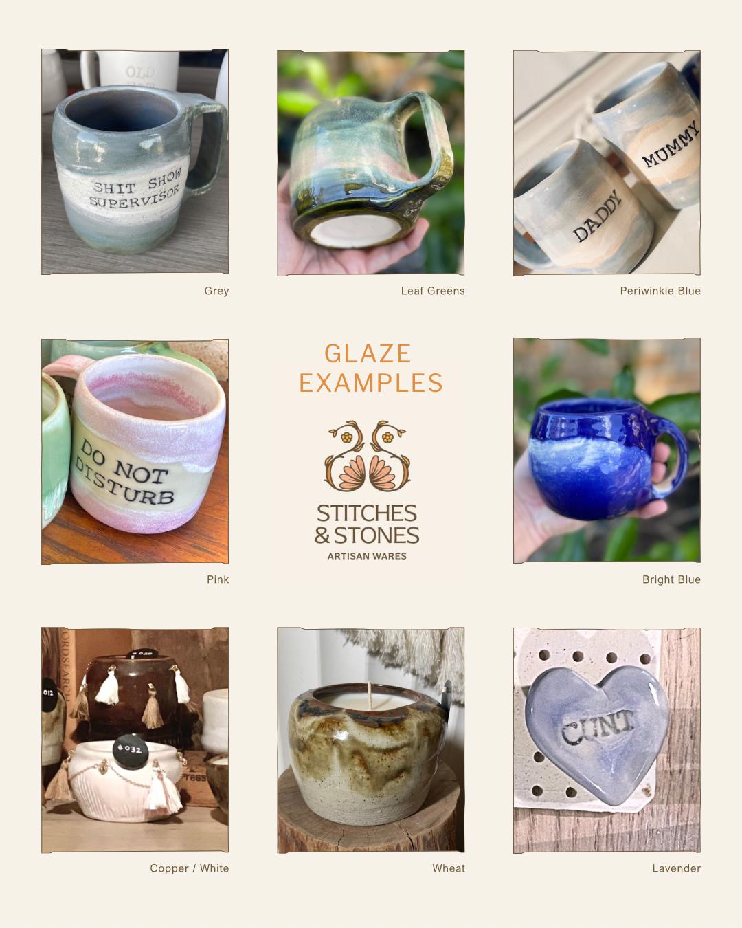 Available colours do change. Please select a preferred colour in the Variations options. If you’d like a specific effect please send me a msg with any inspo pictures, otherwise creative application will be chosen by the artist. No guarantees are made to achieve specific colour effects as kiln results can be unpredictable.